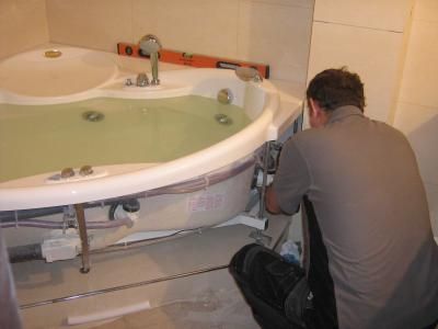 В начале работы необходимо отсоединить старую ванну. Для этого следует перекрыть доступ воды, а оставшееся ее количество слить. Перед тем, как произвести монтаж джакузи, вам потребуется схема расположения электропроводки, труб канализации и водоснабжения. Напряжение и мощность системы электропитания должна соответствовать нормам безопасности. Прежде всего, обеспечьте наличие УЗО (устройство защитного отключения) и заземлите кабель, отходящий от джакузи.