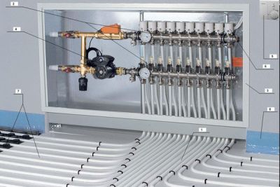 От котла в коллекторный шкаф подводится подающий горячую воду трубопровод, а из шкафа к котлу подходит «обратка». На оба трубопровода в шкафу устанавливается запорная арматура, а затем подключается коллектор, который распределяет горячую воду по контурам и собирает отдавшую тепло воду для подачи в котел.